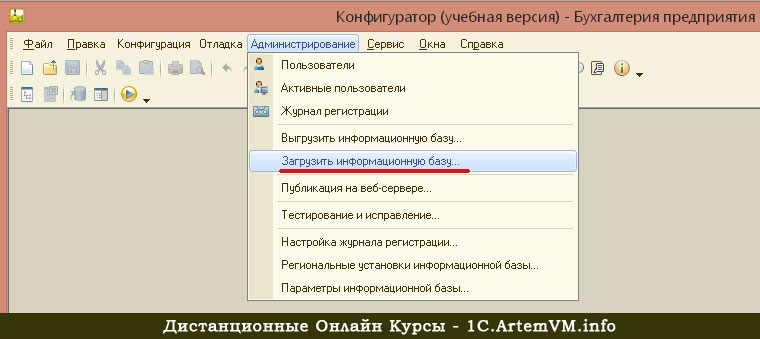 Сам по себе файл выгрузки бесполезен и требует запуска Конфигуратора, т.е. нельзя просто так запустить файл выгрузки (как, например, фильм) и ожидать результата. Поэтому запускаем Конфигуратор и заходим в меню Администрирование.
