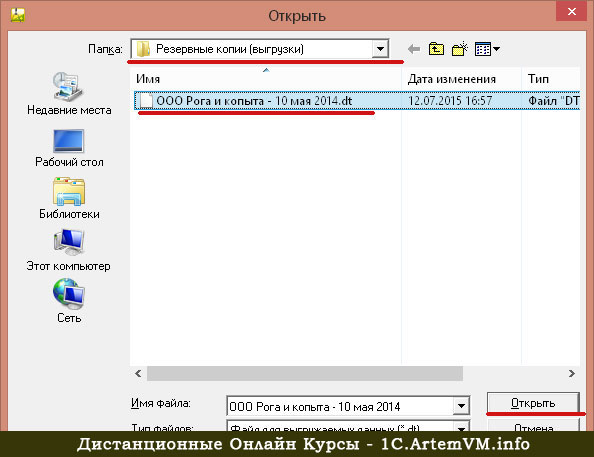 Внимание! Будьте предельно осторожны при выборе файла, если у вас их несколько. Особенно если они принадлежат разным фирмам! Операция восстановления базы из выгрузки не может быть отменена.