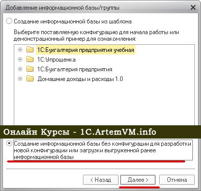 А ещё загрузку ранее выгруженных данных можно производить в полностью пустую базу, т.е. без конфигурации вообще. Создать такую базу можно так же, как описано в соответсвующей статье. Единственное отличие в том, что в окне выбора шаблона конфигурации нужно выбирать не шаблоны, а самый нижний пункт, как показано на рисунке.
