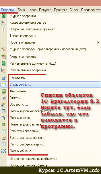 В 1С Бухгалтерии 8.2 в меню Операции есть общие списки всех объектов программы, при помощи которых можно быстро найти то, что вам нужно. На рисунке ниже эти списки выделены.