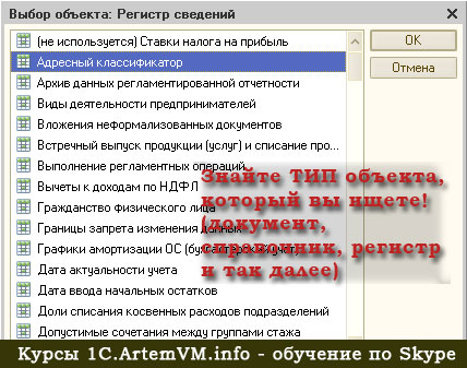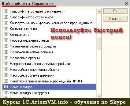 Как видите, можно быстро найти то, что нужно, если вы забыли или вообще не знали, где оно находится. Самое главное — знать тип объекта, который вы ищете, чтобы открыть нужный список. К примеру, КЛАДР является вовсе не справочником, а регистром сведений.