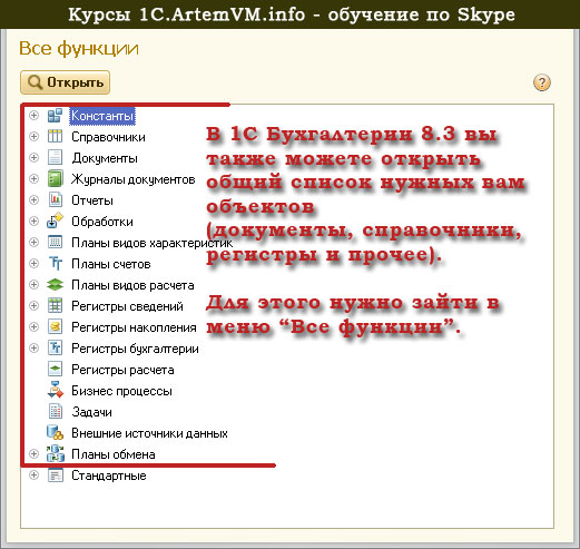 Вы всегда можете найти нужный вам документ, регистр или справочник в общих списках объектов 1С Бухгалтерии, будь то версия 8.2 или 8.3.