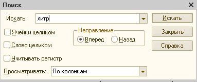 Следует запомнить, что в такого рода окнах не работает обычный быстрый поиск 1С Предприятия. Для поиска значений нужно воспользоваться функцией контекстного поиска, нажав Ctrl + F на клавиатуре. Появляется обычное для любой программы окно.
