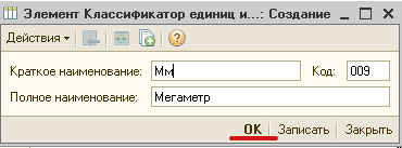 Когда нужная строка найдена, дважды щёлкните на ней и появится форма добавления нового элемента справочника, но уже заполненная данными из классификатора. Именно таким способом и следует добавлять новые элементы в такого рода справочники.