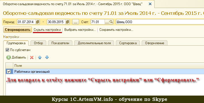 У всех видов отчетов в 1С есть кнопка "Показать настройки". Принцип настроек любых видов внутренних отчетов 1С одинаков: отбор (фильтр), группировка данных, сортировка и т.д
