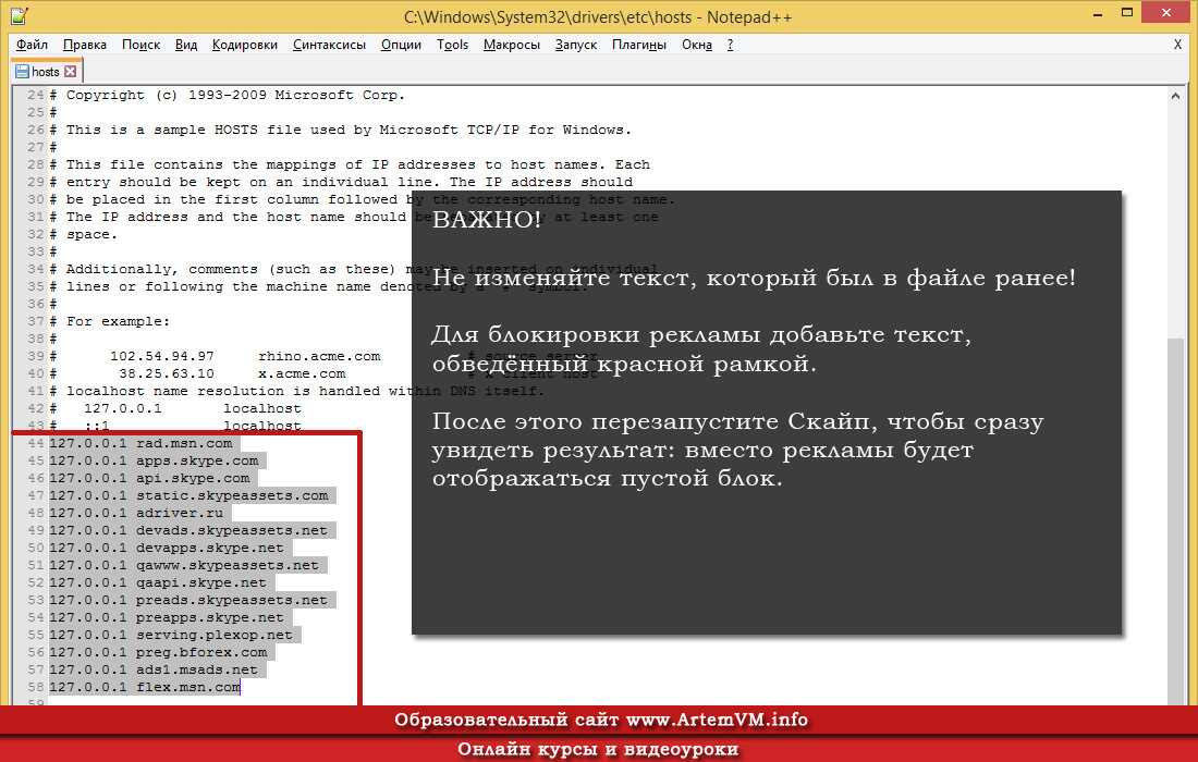 Откройте файл hosts обычным Блокнотом и добавьте в него указанные выше записи, запрещающие Скайпу обращаться к сайтам и загружать рекламу.